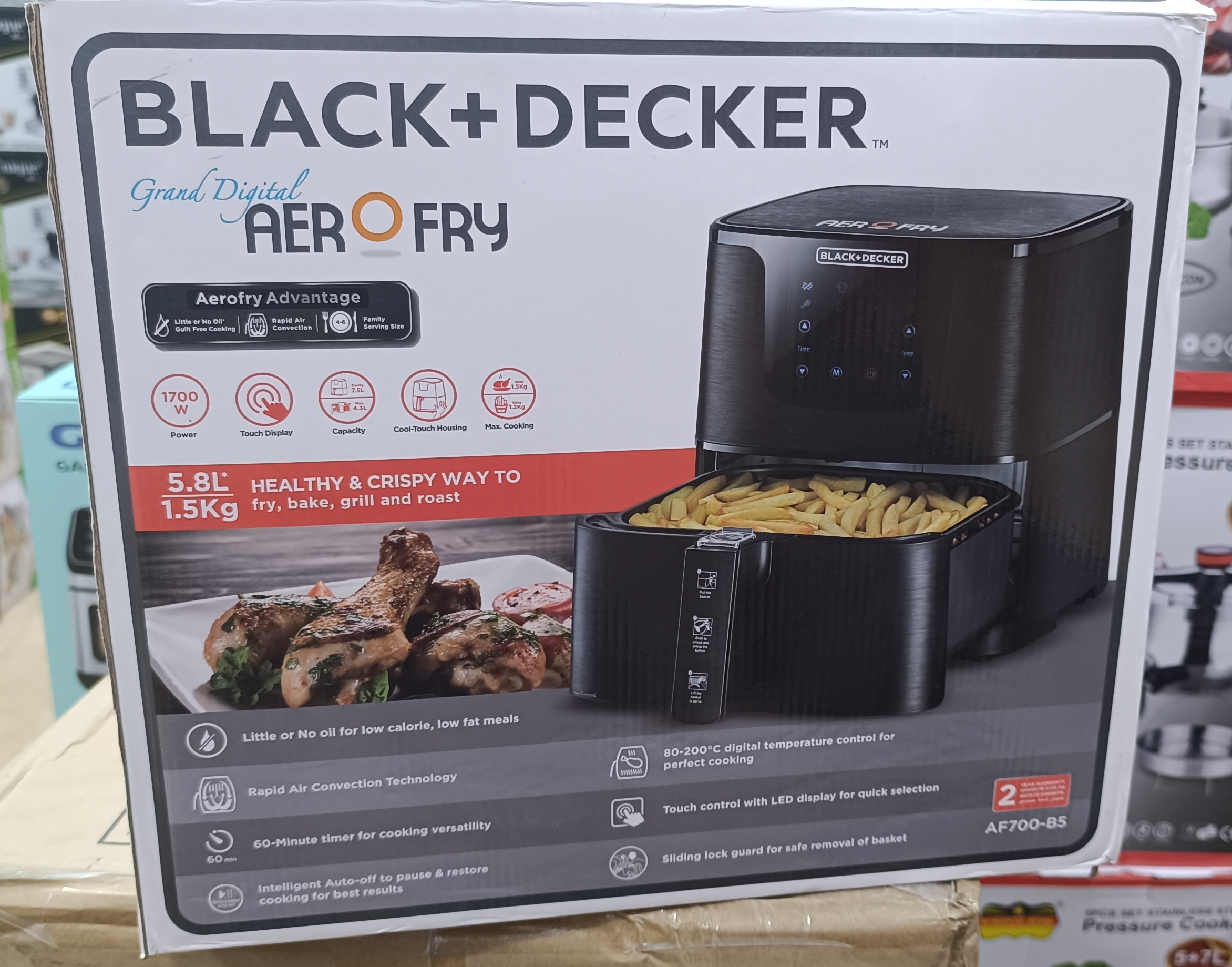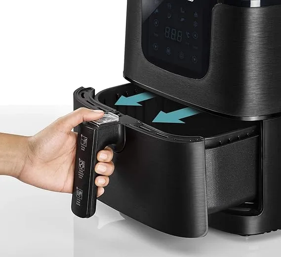 ظرفیت 5.8 لیتری مخزن و سبد 4.3 لیتری آن فضای کافی برای آمادهسازی حجم زیادی از مواد غذایی (تا 1.5 کیلوگرم) را در اختیار شما قرار میدهد و آن را به گزینهای مناسب برای وعدههای خانوادگی تبدیل میکند. وجود صفحه نمایش لمسی دیجیتال با کنترل دمای 80 تا 200 درجه سانتیگراد و تایمر 60 دقیقهای باعث میشود بتوانید با دقت بالا انواع غذا مانند سیبزمینی، مرغ، گوشت، ماهی، کیک و پیتزا را آماده کنید.